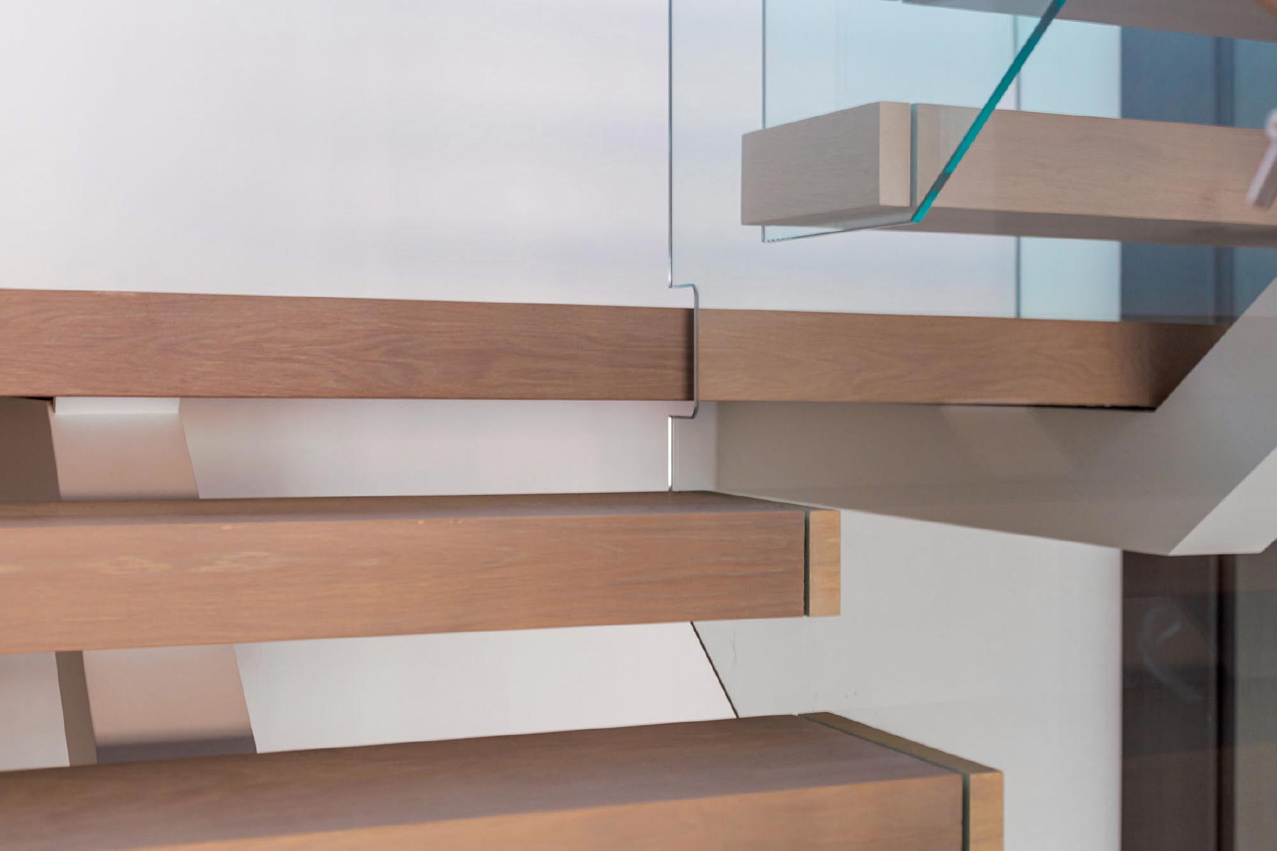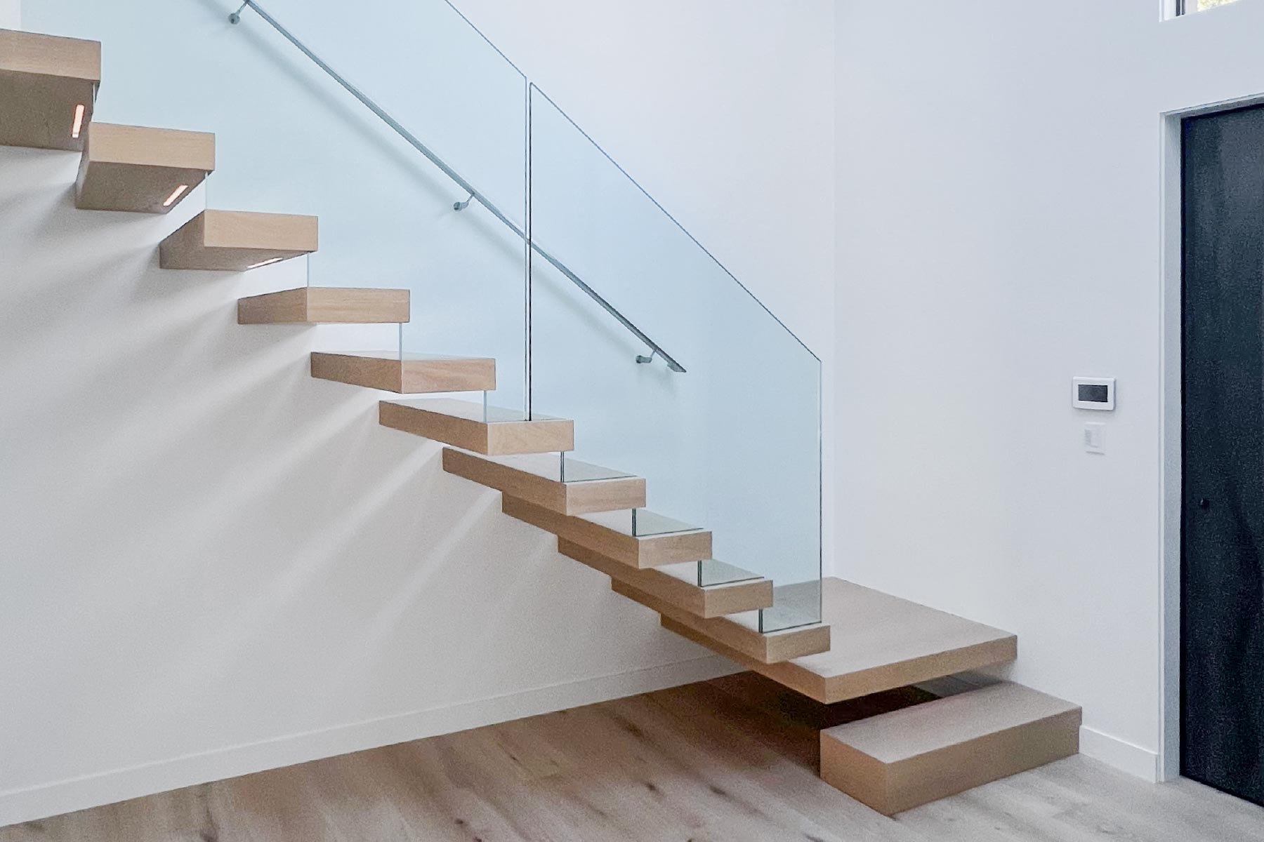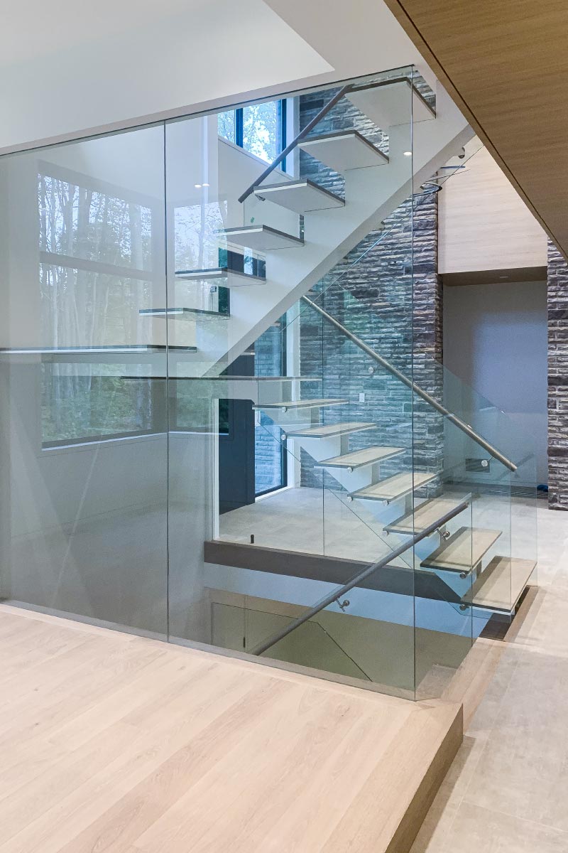 A floating stair outfitted with a frameless glass guard offers most openness and transparency.