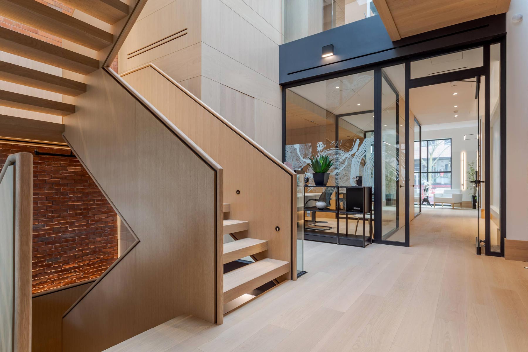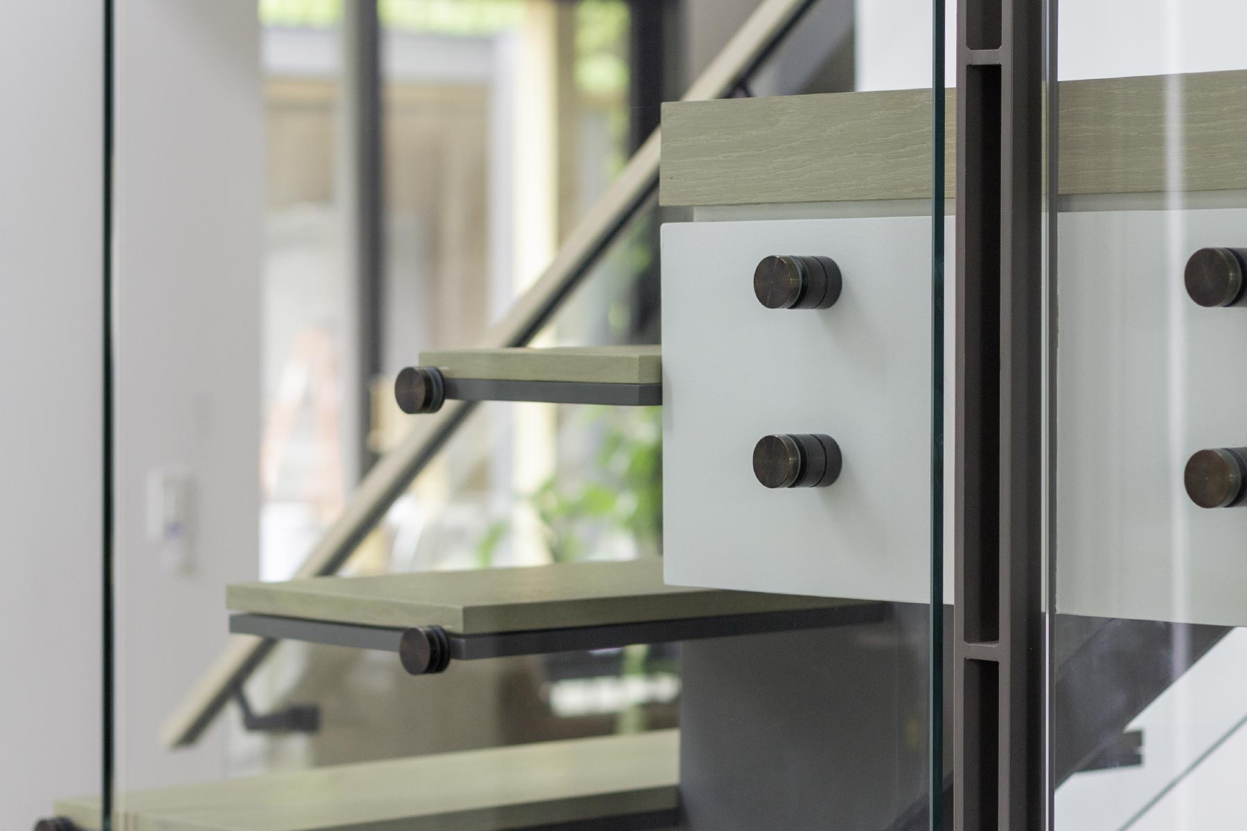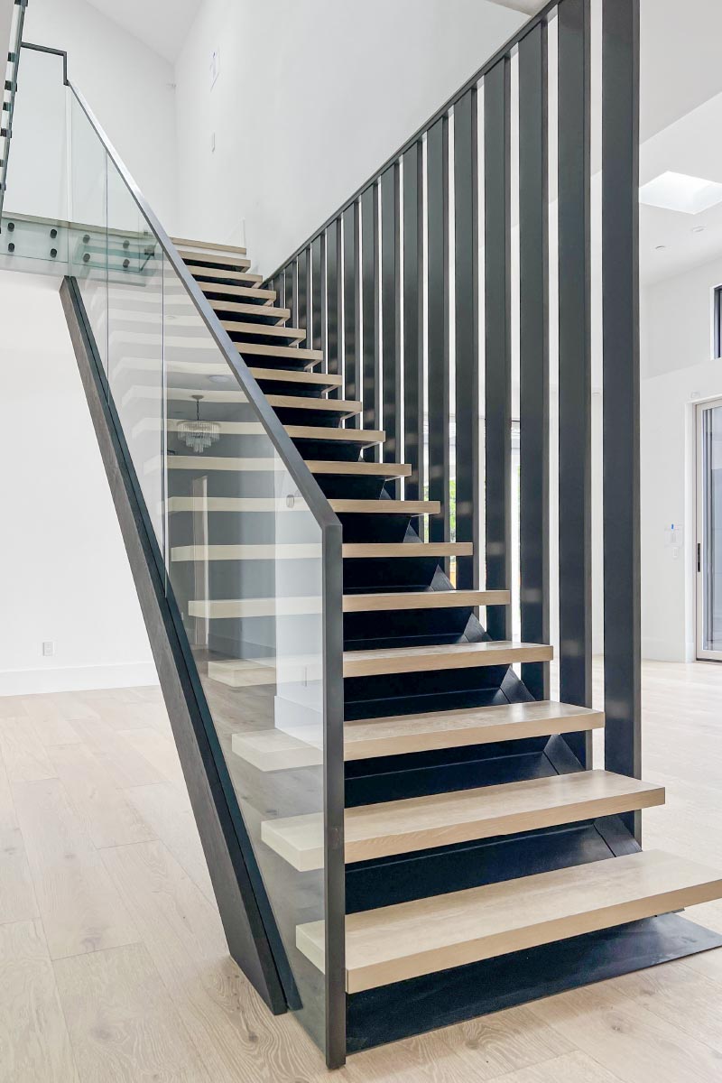 A floating stair outfitted with a frameless glass guard offers most openness and transparency.