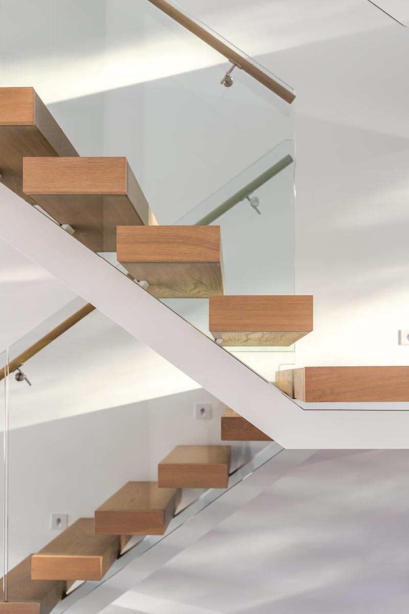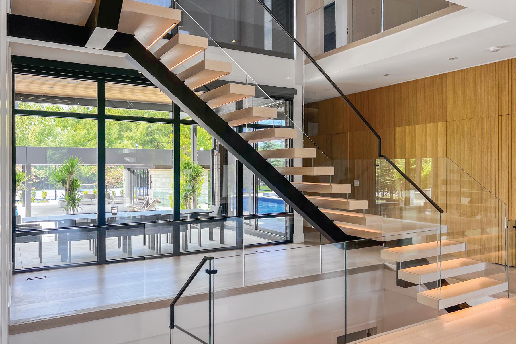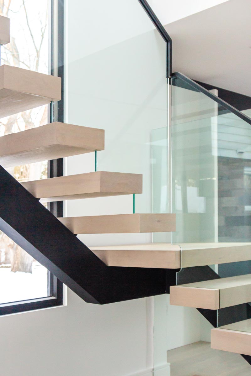 Our innovative stair design, Hovering Steps, features steps that appear to float above the stringer, creating a sense of suspension. The staircase’s light and transparent aesthetic is enhanced by glass panels that extend from the steps, showcasing their smooth, uncut underside.