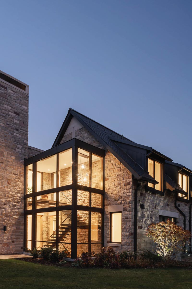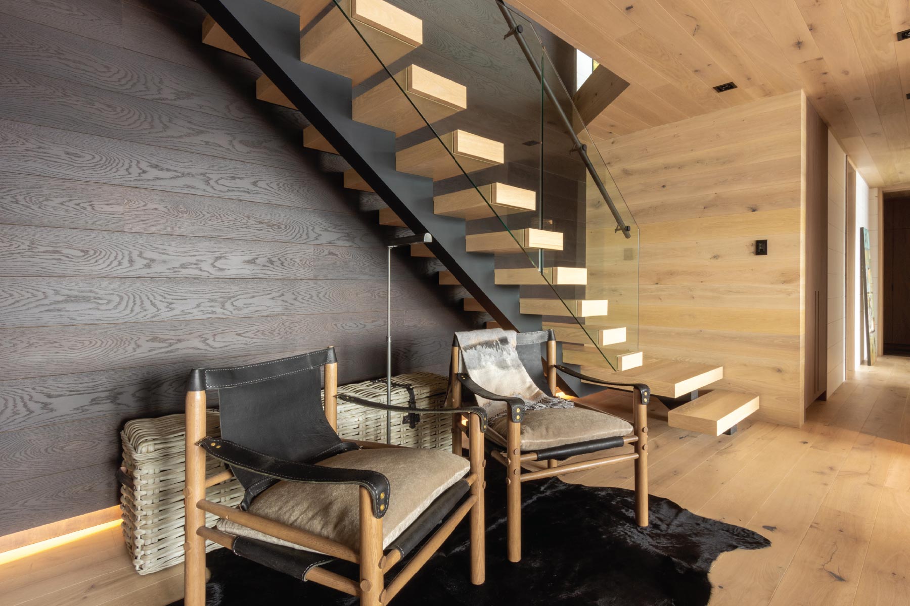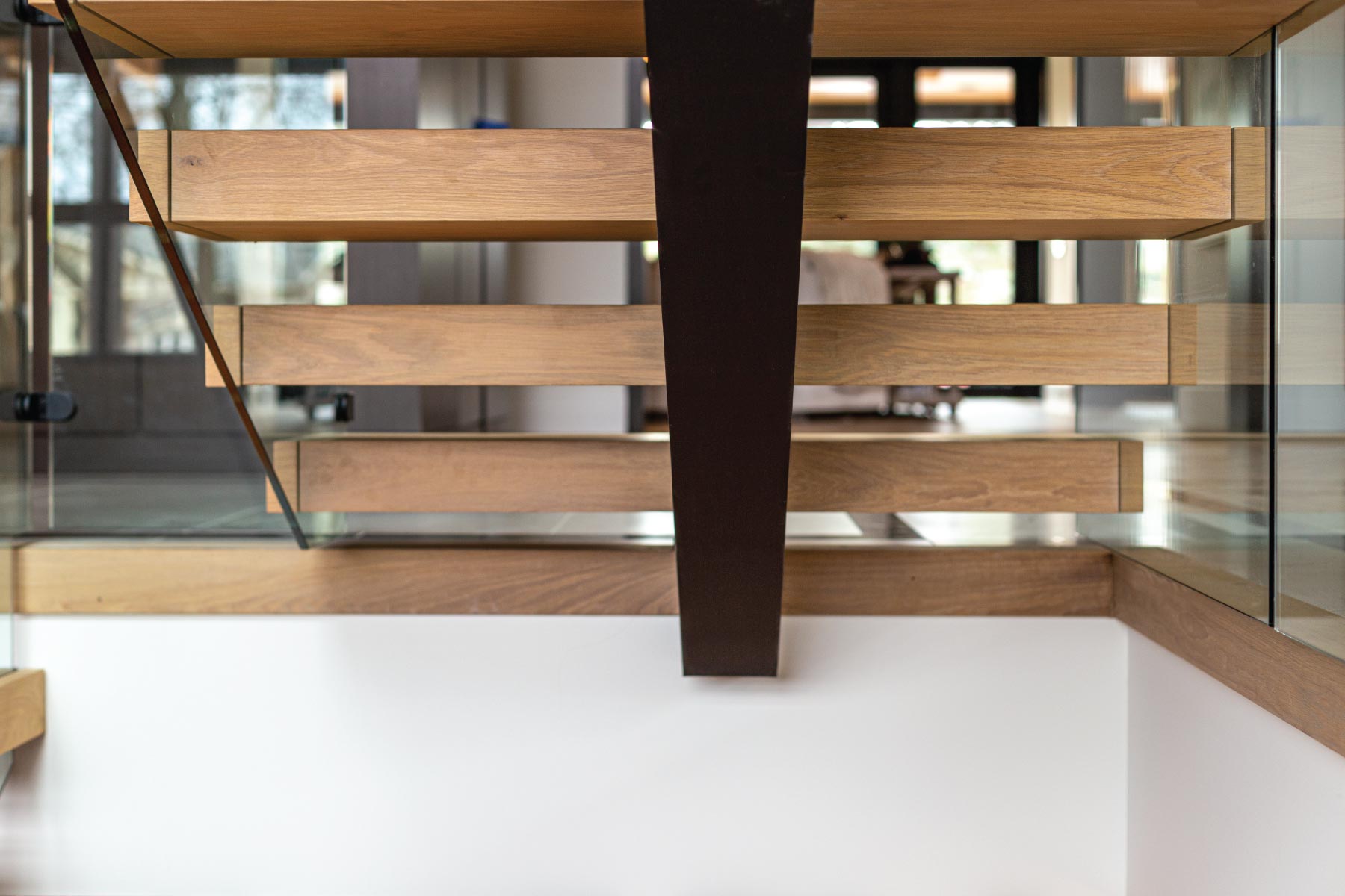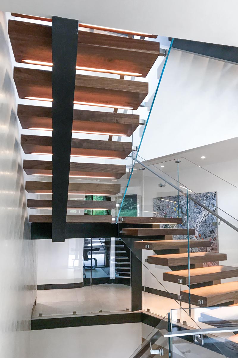A spine like steel under mount stringer supports metal steps which are later wrapped with box like wood liners.