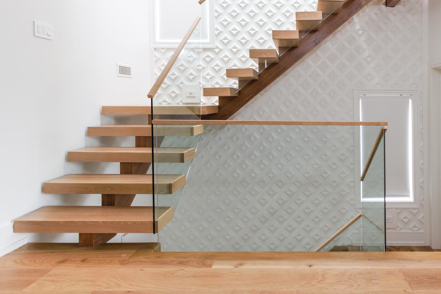 A glass guard may be secured to the metal steps. Glass securing hardware (cylinder shaped stainless steel standoffs) may stay visible or be enclosed in the wood step box for a cleaner look.