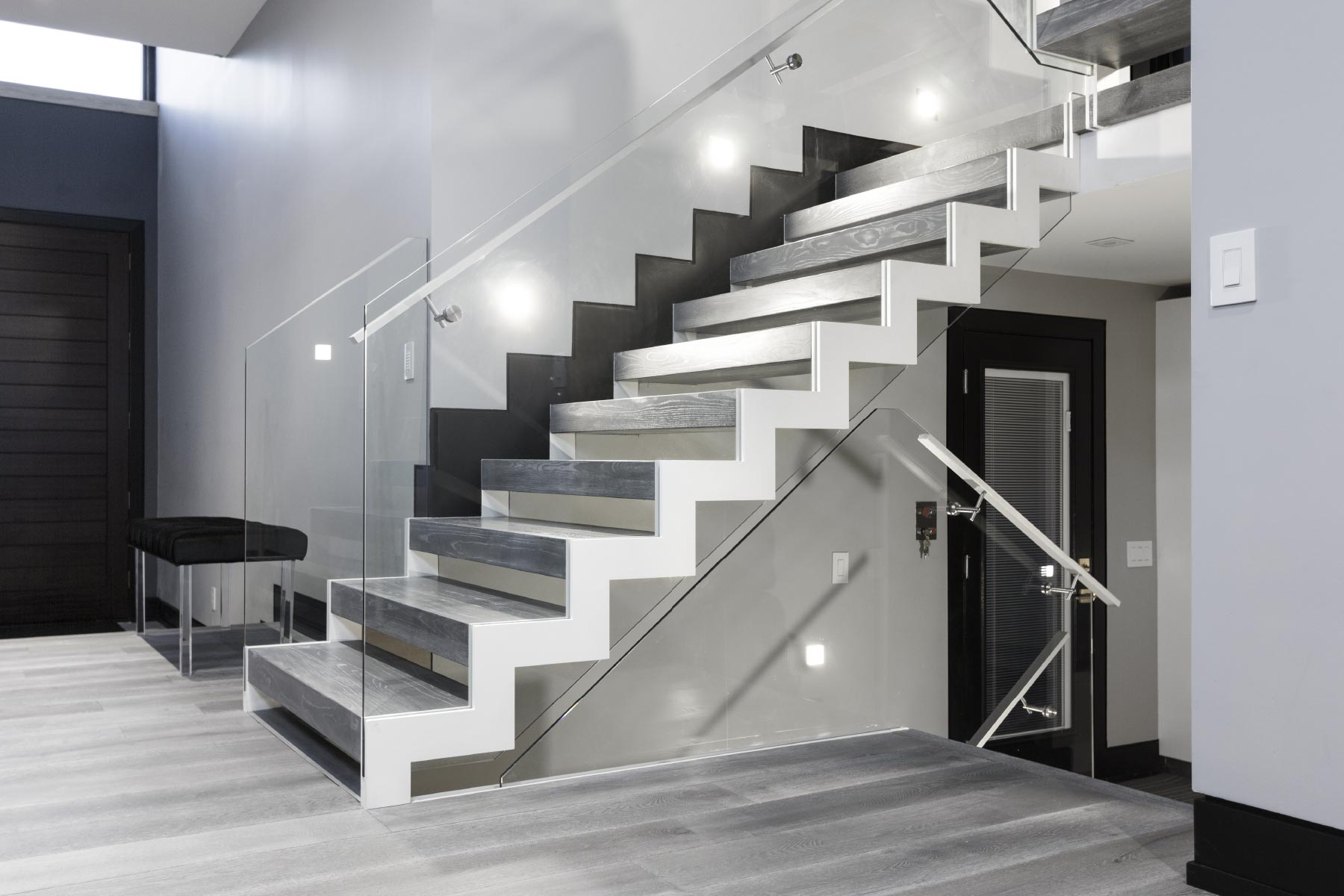 The zigzag open riser stairs feature two visible steel stringers, positioned on either side of the box steps in a zigzag pattern. The most minimal aesthetic is achieved by embedding the glass guards into the stringers.