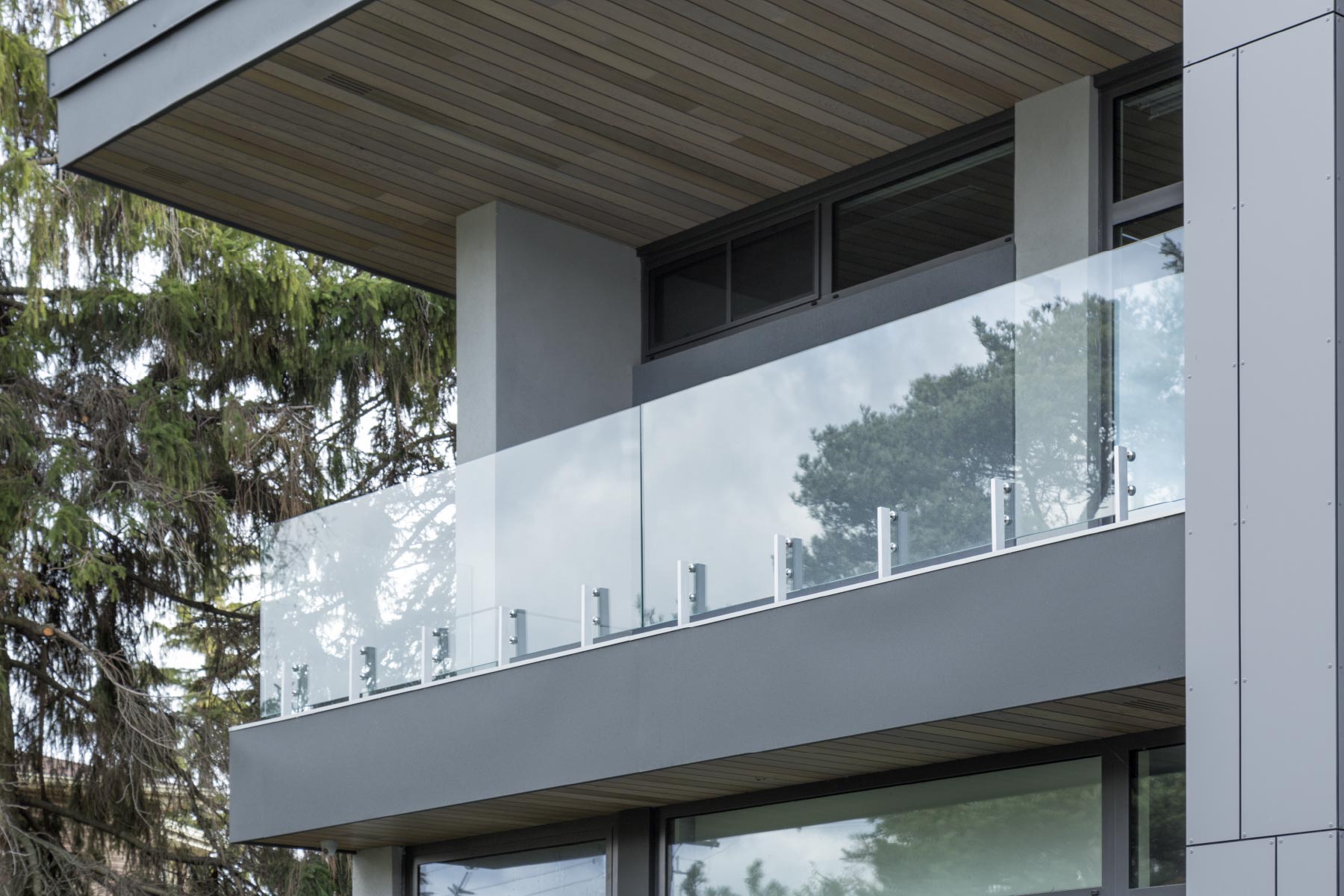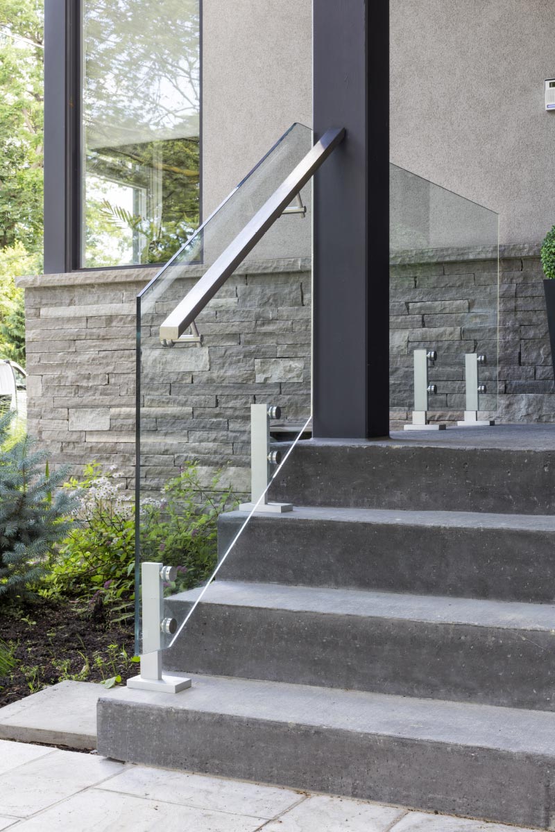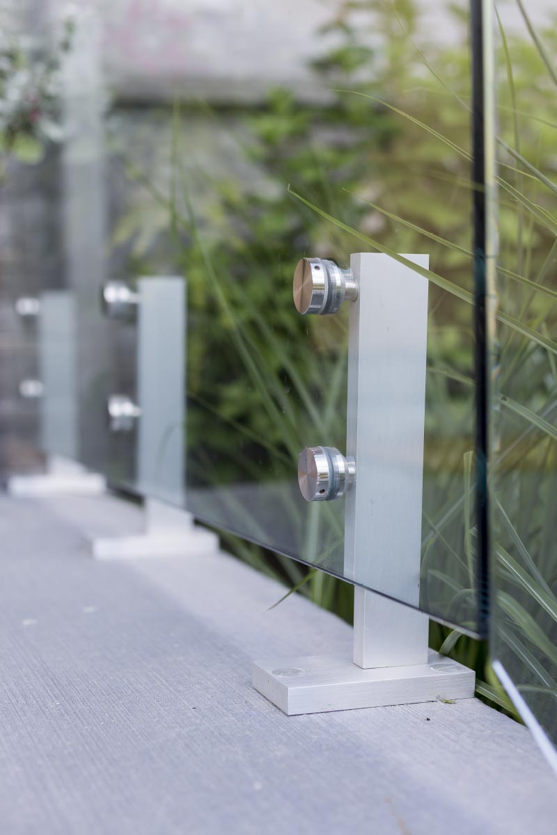 We use minimalistic, rectangular-shaped posts made of either aluminum or stainless steel. The glass is securely attached to these posts using stainless steel adjustable standoffs.