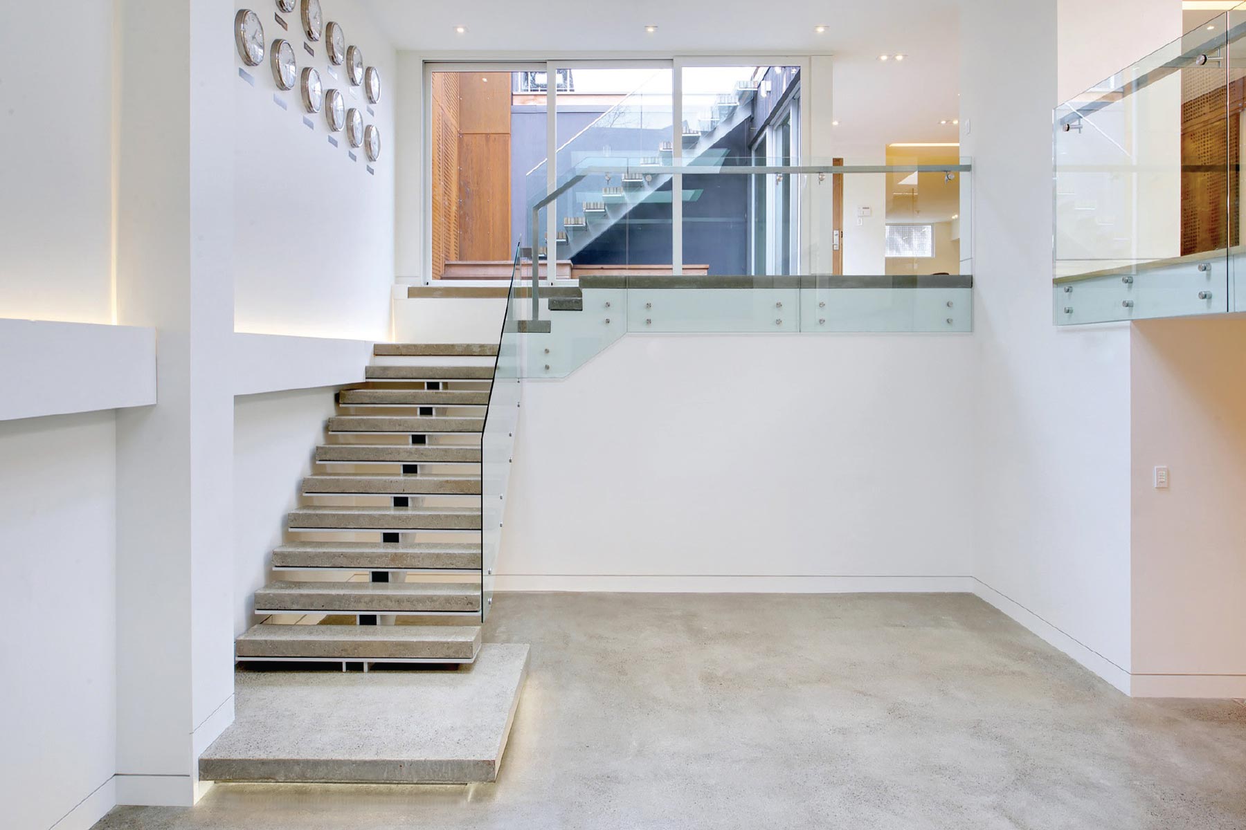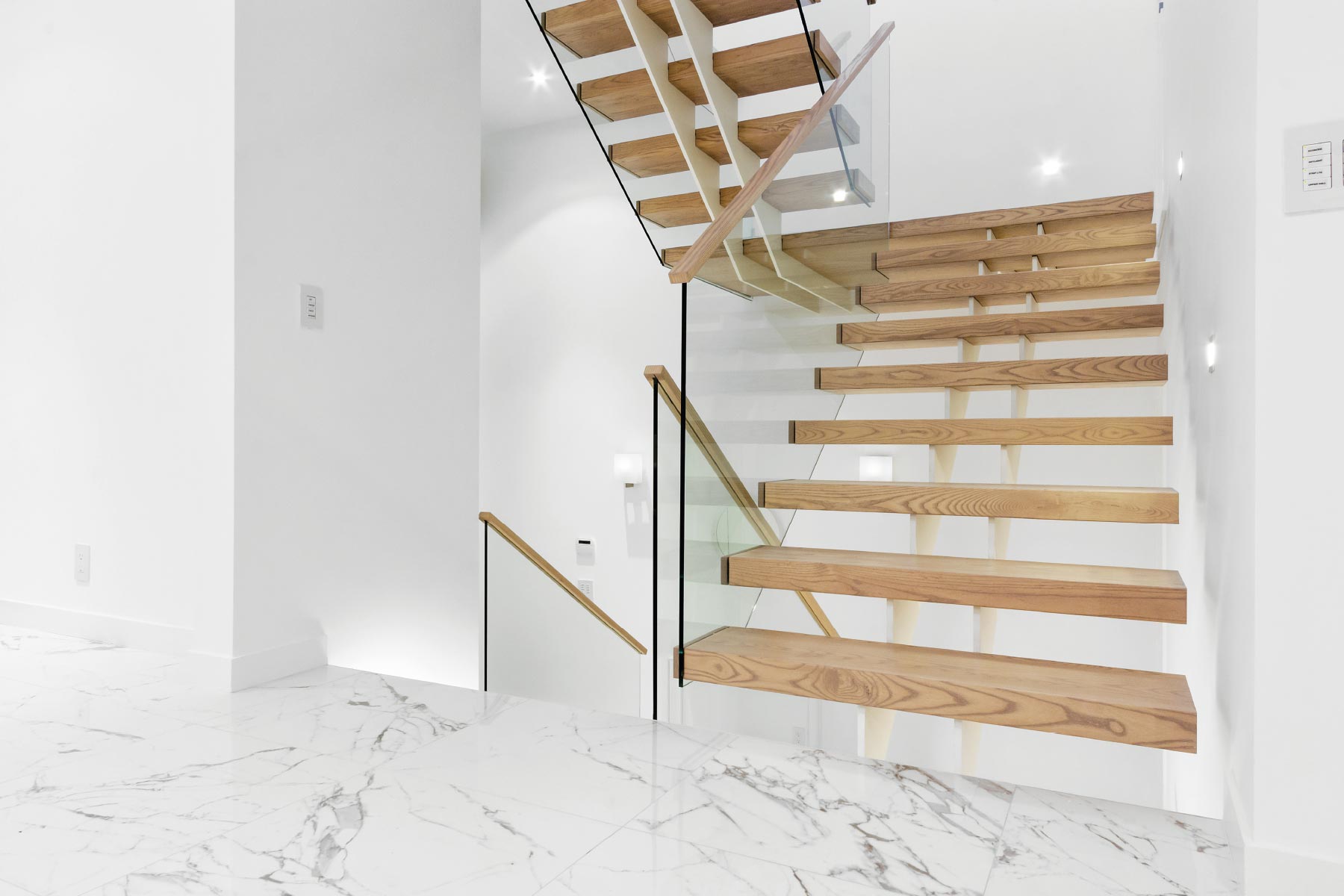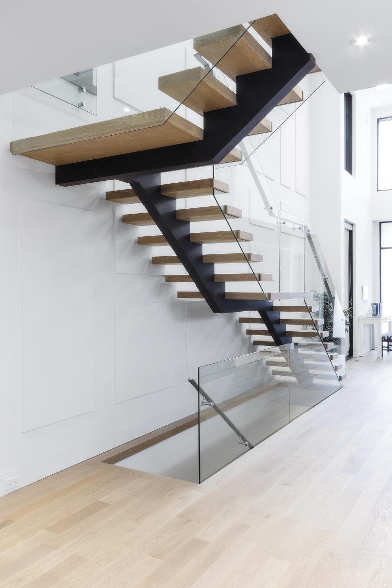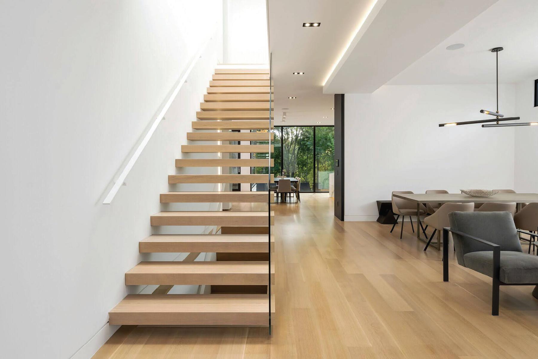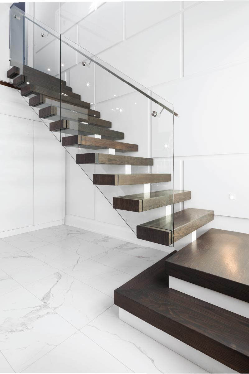 Typically, steps are made from engineered hardwood, as it is the most suitable material for interior stairs. However, other materials can also be used. Our technology enables us to create simple floating box steps in stone, Corian, concrete or similar materials for a unique and versatile design.