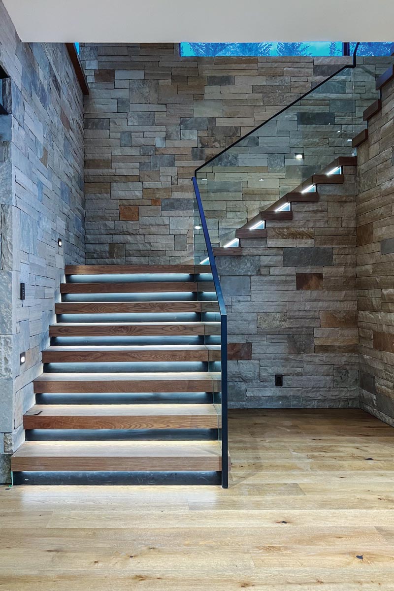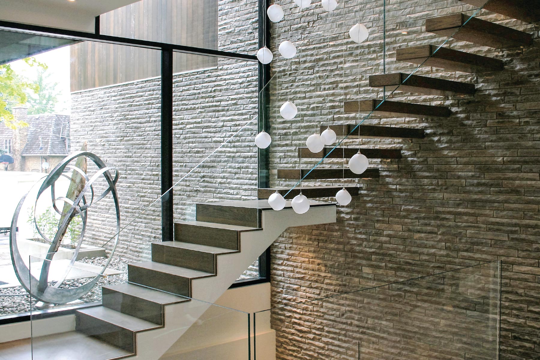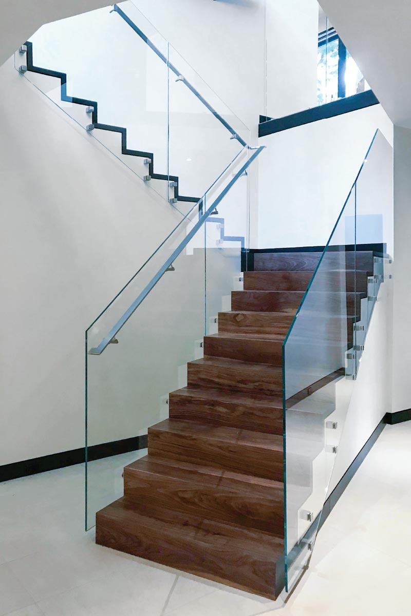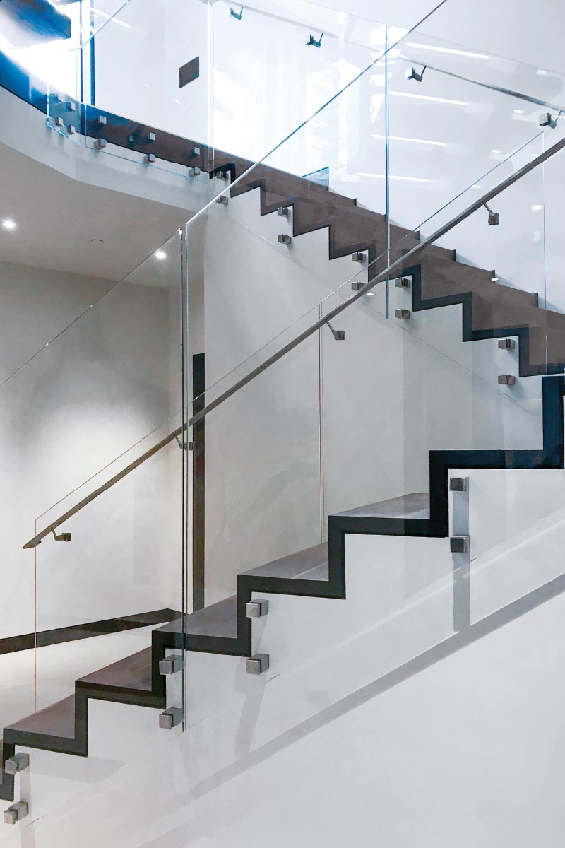 Waterfall stairs can be equipped with visible standoff mounts, allowing the glass panels to be installed after the drywall is completed.