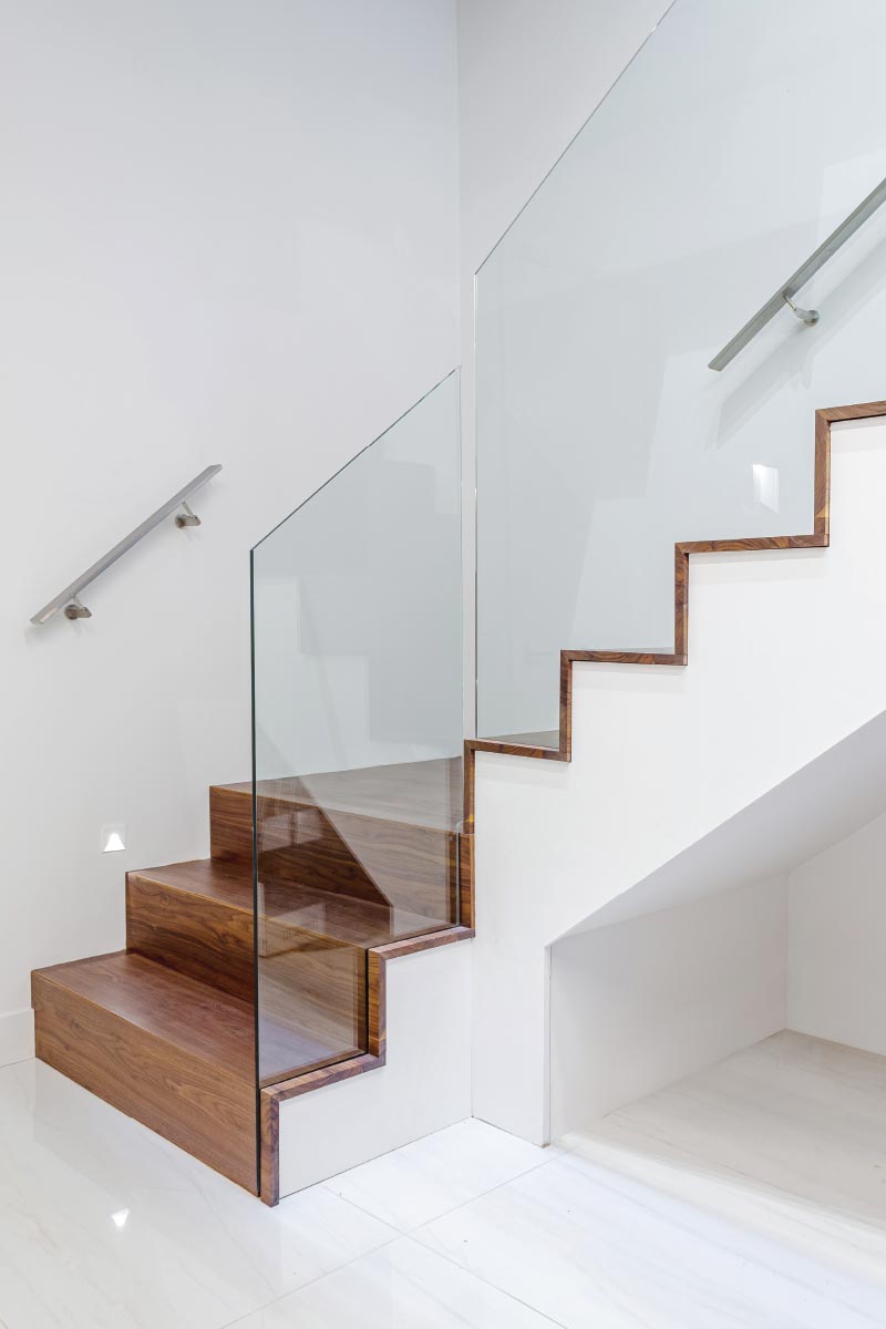 The supporting plywood structure is hidden inside the stair body. The stairs feature a straight undermount structure with a ¾” thick wood top that folds in a zigzag pattern.