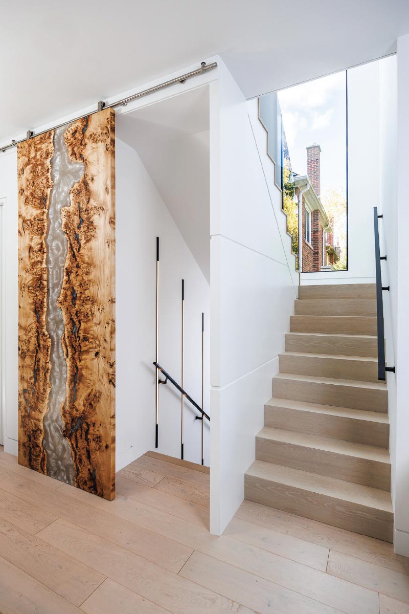 Additionally a close riser staircase can be designed with box steps to match the wood design of the main open riser staircase, creating a cohesive look throughout the space.